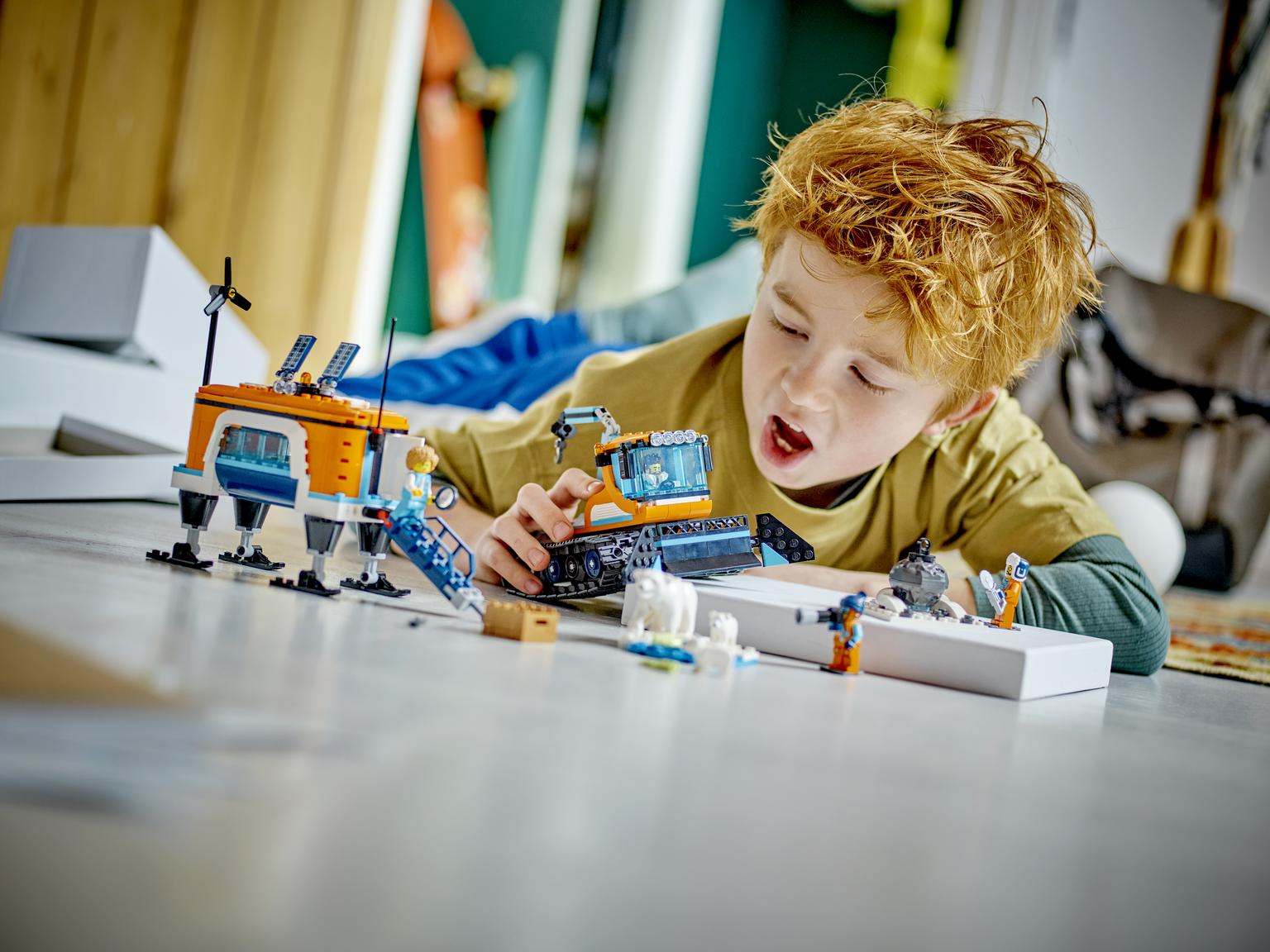 El set de construcción de juguetes LEGO® City Exploradores del Ártico: Camión y Laboratorio Móvil (60378) para mayores de 6 años está lleno de detalles de gran realismo orientados al juego imaginativo, como un vehículo de exploración equipado con orugas, grúa que funciona y quitanieves, además de un laboratorio móvil, una escena de un paisaje ártico, un meteorito, 4 minifiguras y 3 figuras de osos polares. Guías de construcción impresa y digital Ofrece a tu peque una sencilla e intuitiva aventura de construcción con la app LEGO Builder, donde podrá explorar y guardar sets virtuales, acercar, girar y visualizar modelos desde todos los ángulos a medida que construye y controlar su propio avance en el proceso. Juguetes de moda para pequeños exploradores y exploradoras Los sets LEGO City sitúan a los niños en el centro de la acción con fantásticos vehículos, estructuras realistas y divertidos personajes que estimulan la interpretación de historias basadas en situaciones de la vida real.