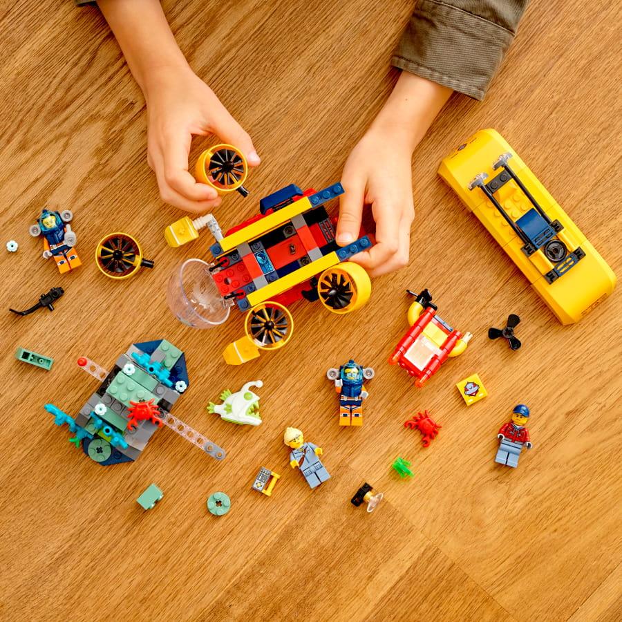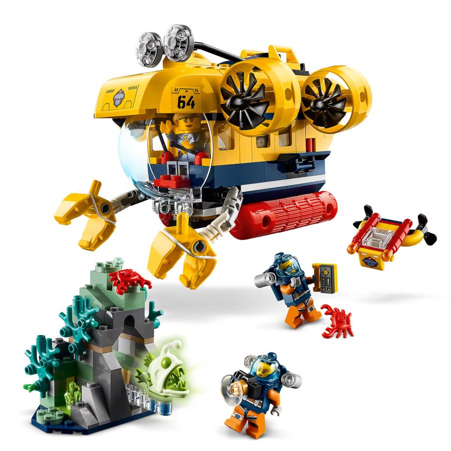 • ¿Qué contiene la caja? Un submarino de juguete, un dron subacuático y una escena ambientada en el lecho del mar cubierta de corales, así como 4 minifiguras (entre ellas Jessica Sharpe, de la serie para televisión LEGO® City Adventures, y 2 buzos con geniales accesorios), y una figura de un pez depredador abisal que brilla.