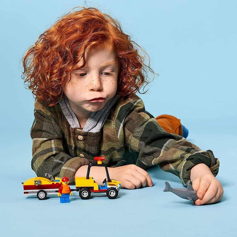 Este set de construcción contiene un quad de juguete con remolque para transportar la moto acuática incluida, una minifigura de un socorrista y una figura de un tiburón. ¡Todo lo que un niño necesita para disfrutar de horas de juego creativo!