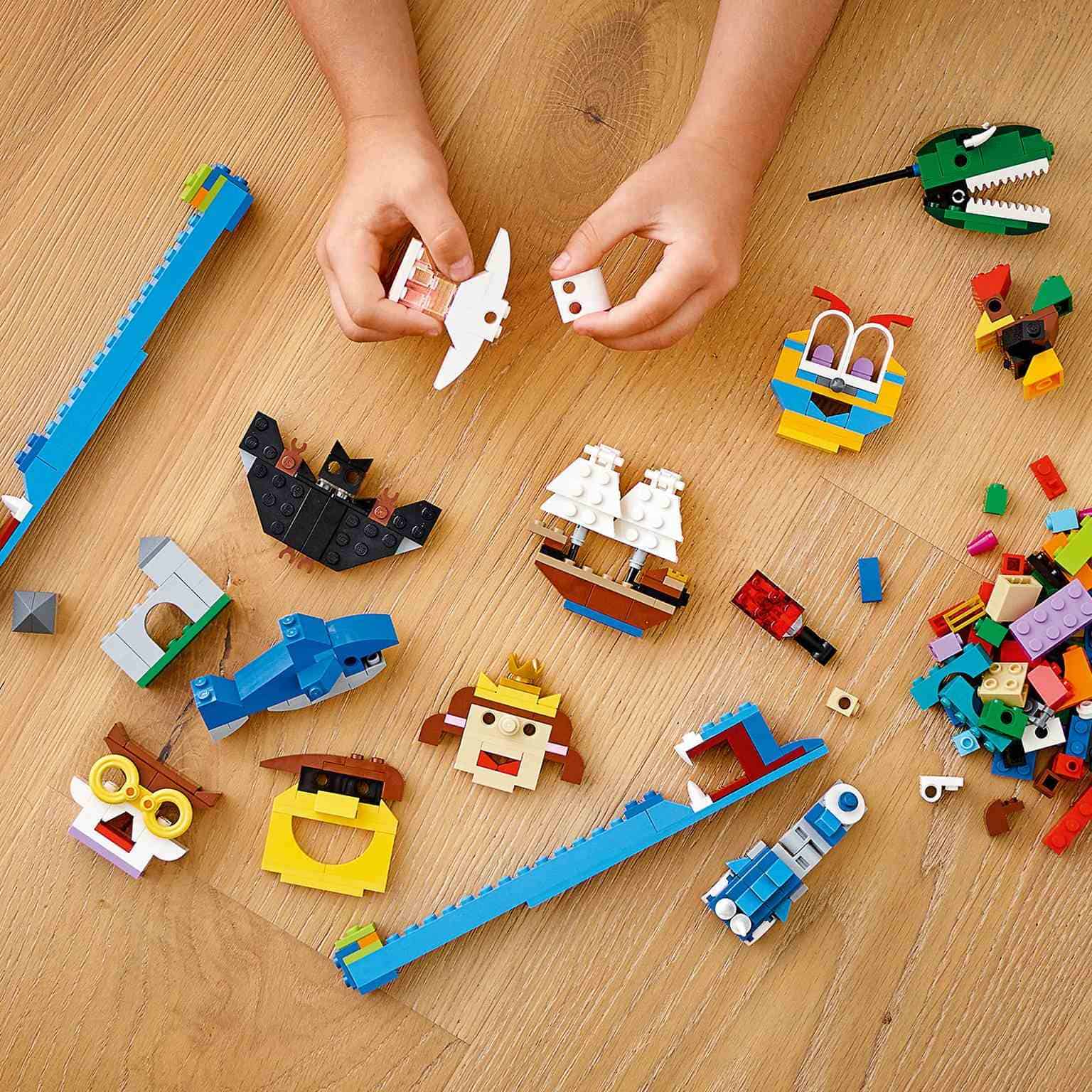 Hay 12 divertidos juguetes LEGO® para armar (un castillo, una cara, una princesa, un murciélago, un gallo, un ladrón, un barco pirata, un búho, un fantasma, un molino de viento, un tiburón y un dinosaurio), y ladrillos adicionales.