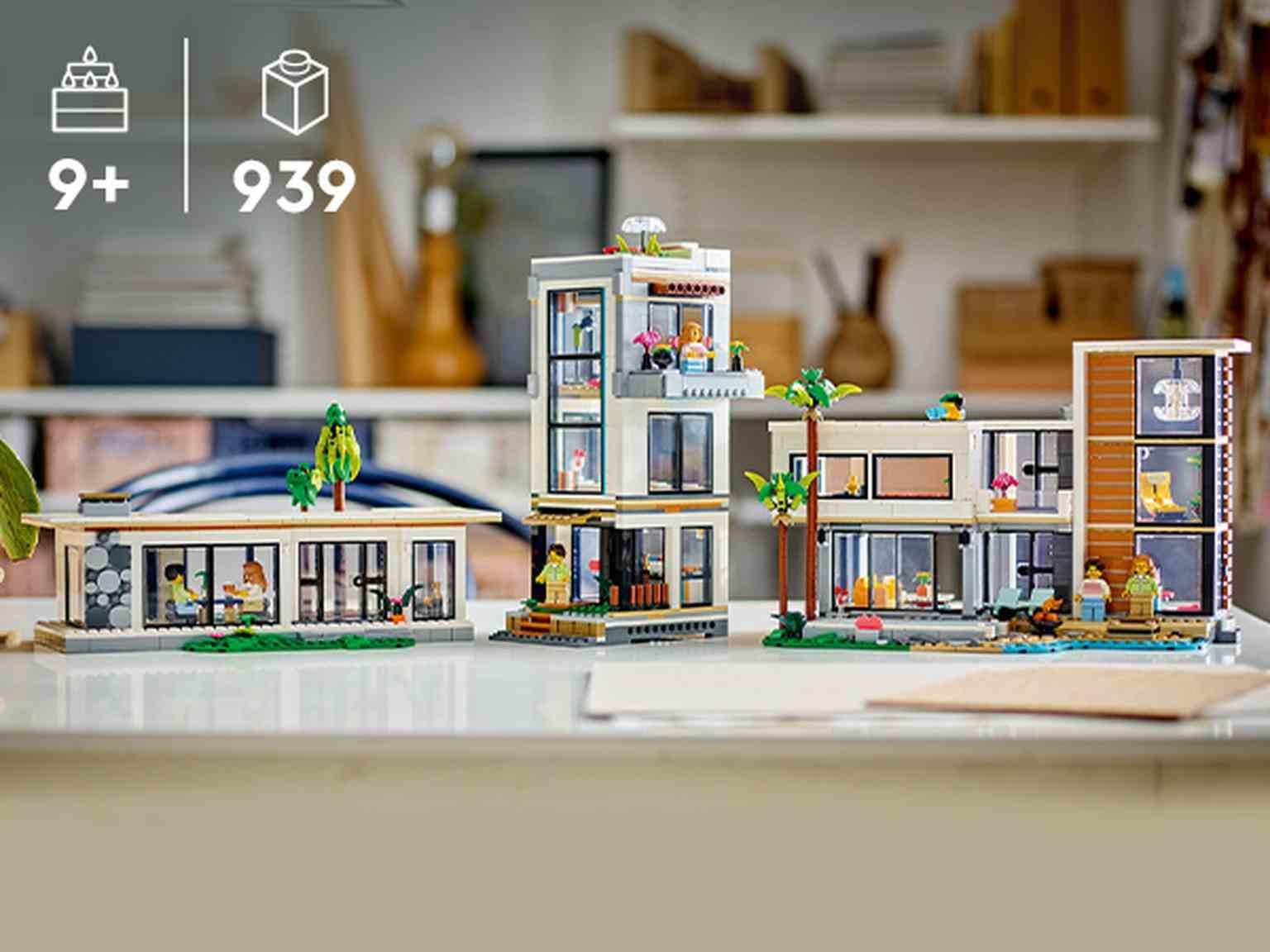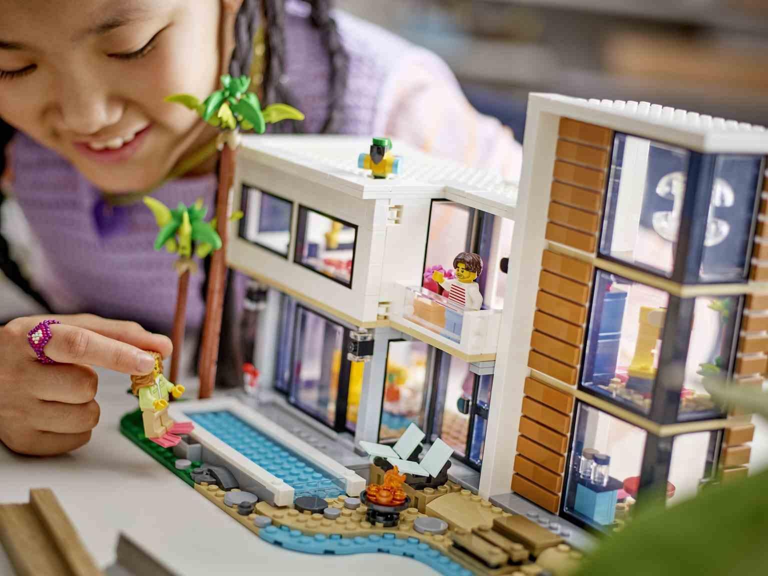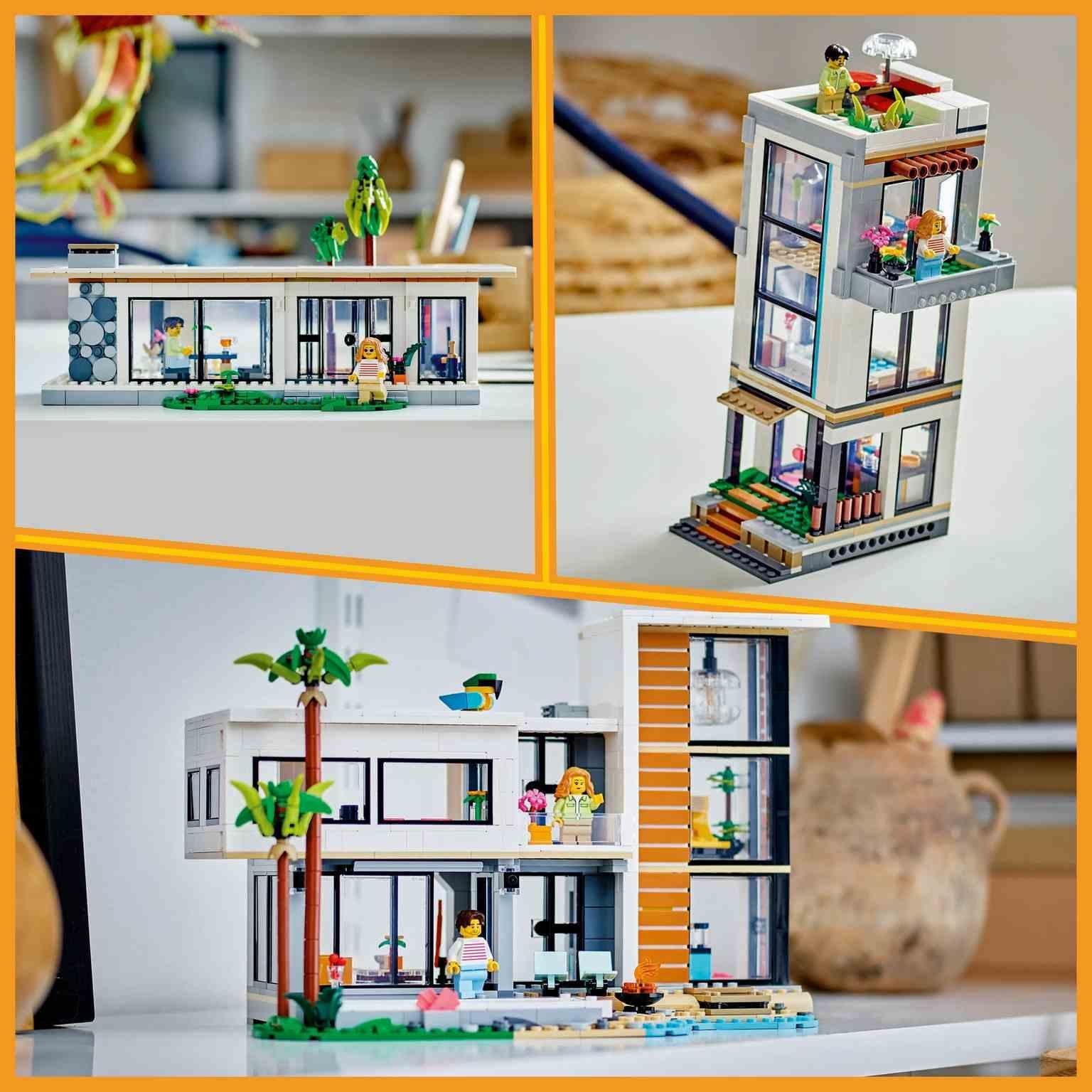 Los niños y las niñas a partir de 9 años pueden explorar 3 casas LEGO® de juguete distintas con el juego Casa Moderna (31153). La lujosa casa de la playa de 2 plantas cuenta con cocina, salón, sala de lectura, dormitorio, cuarto de ducha, balcón ymobiliario moderno, como un sillón y una araña, recibe la sombra de 2 palmeras y tiene piscina. Este set de construcción LEGO ofrece un mundo de emocionantes posibilidades de juego con los 3 modelos de casas que se pueden construir usando los mismos la drillos. Los niños pueden crear la Casa Moderna, convertirla en un elegante edificio urbano de 3 plantas con bañera de hidromasaje y terraza en la azotea o transformarla en una cabaña del bosque. Accede a las habitaciones por la parte trasera de la Casa Moderna y el edificio urbano, o quitando el techo de la cabaña del bosque. El set incluye 2 minifiguras con ropa intercambiable. Los fans de LEGO disfrutarán de una divertida experiencia digital construyendo los 3 modelos con la app LEGO Builder.