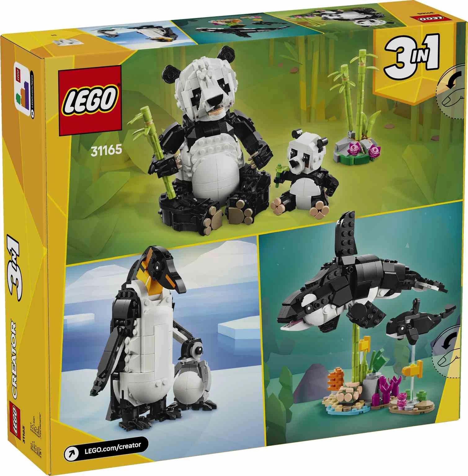 Los peques a partir de 8 años comparten el cariño y los divertidos juegos de 3 familias de animales con el set Fauna Salvaje: Familia de Pandas (31165). La pareja de pandas está formada por un adulto (con boca, cabeza, cuello y garras articulados)y su cría, acompañados de un brote de bambú como tentempié. Los niños pueden construir cualquiera de 3 juegos LEGO® de animales con los mismos ladrillos: una figura articulada de un panda con su cachorro al lado de tallos de bambú; una figura articulad a de una orca con su cría, que pueden exponerse juntas en bases transparentes; o un pingüino de juguete articulado con su polluelo en una zona de hielo y agua. Las 3 escenas son un gran regalo LEGO para jugar y exponer con imaginación. Los sets LEGO Creator 3en1 estimulan la creatividad de los peques con los 3 modelos para construir de cada caja, inspirados en algunas de sus mayores pasiones, como los vehículos, los animales y las casas. Nota: Los modelos no se pueden construir simultáneamente.