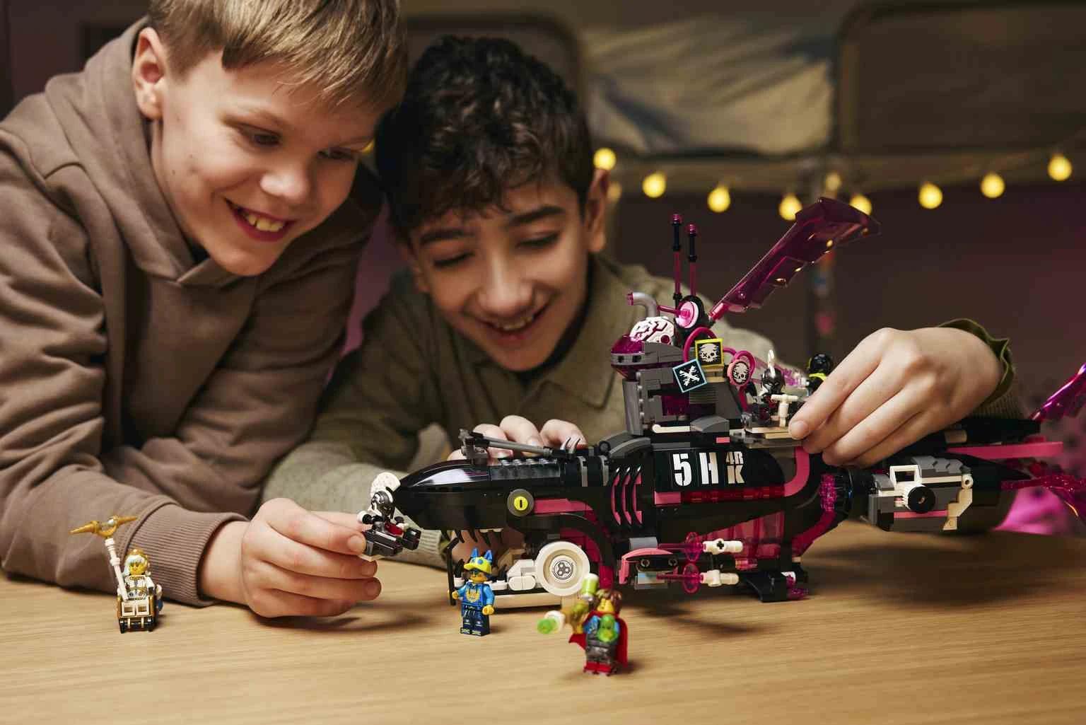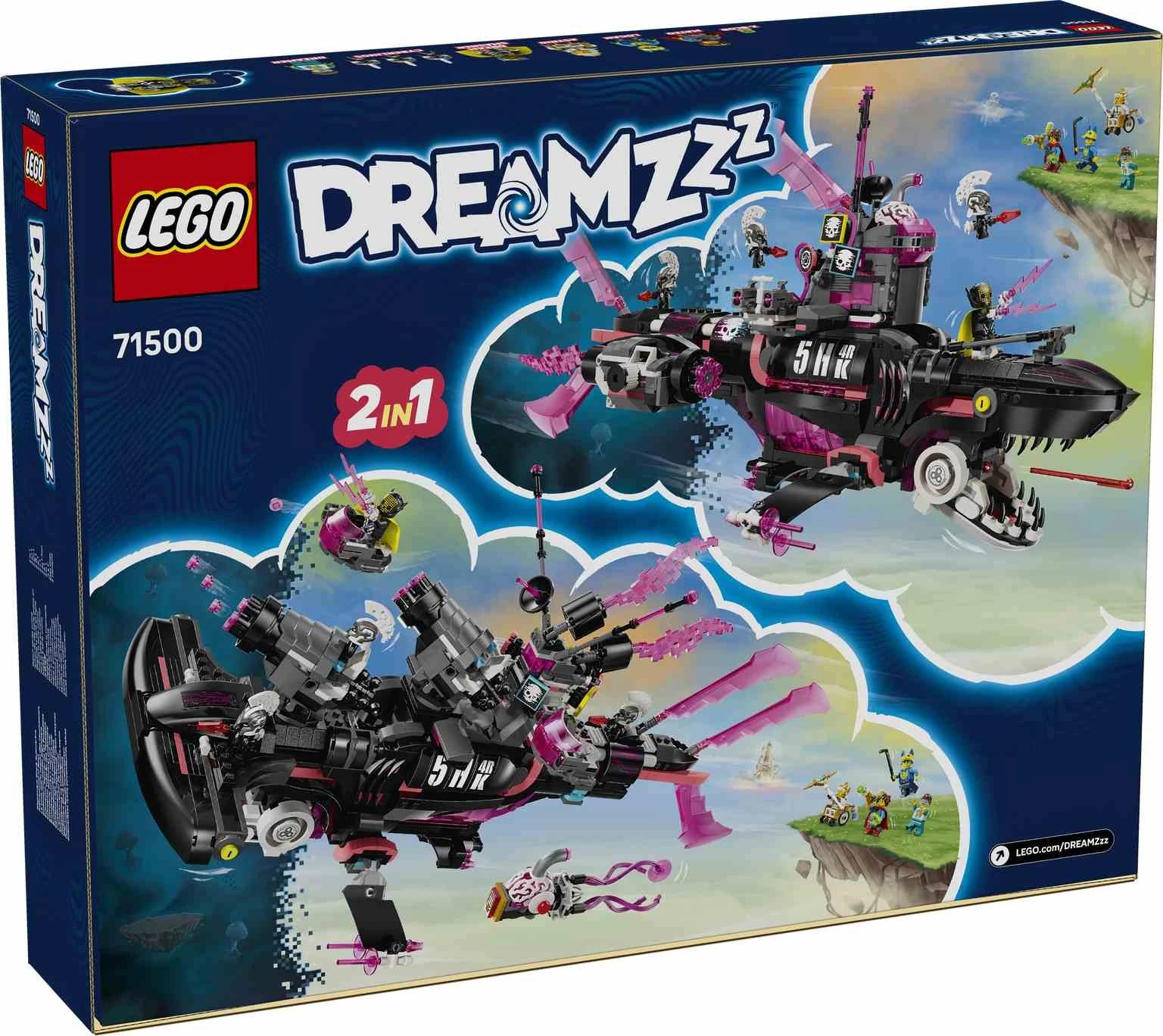 ¡Todo listo para la inmersión en el Mundo Sueños a bordo del set de construcción LEGO® DREAMZzz™ Submarino-Tiburón de las Pesadillas (71500) para niños y niñas a partir de 9 años! Este juego de fantasía, con oleadas de asombrosos detalles, permitea los fans sumergirse en una épica aventura junto a Mateo, Logan y Astrid. Los jóvenes soñadores construyen un modelo de un tiburón antes de transformarlo en un Submarino-Tiburón o en un Acorazado-Pez Martillo. Tiene miniaeronaves, cañones que disparan , misiles, una cabina que se abre y una prisión dentro del tiburón. Incluye cañones modulares compatibles con otros sets de la gama LEGO DREAMZzz para 2025 (a la venta por separado). Las minifiguras de Mateo, Logan, Astrid, el Destructor de Sueñosy un Soñador, y las figuras de Z-Blob y 3 Cyberlings dan vida a la acción. El set, un emocionante regalo para peques, viene con instrucciones de construcción con historia que les animan a vivir la aventura y convertirse en héroes del Mundo Sueños.