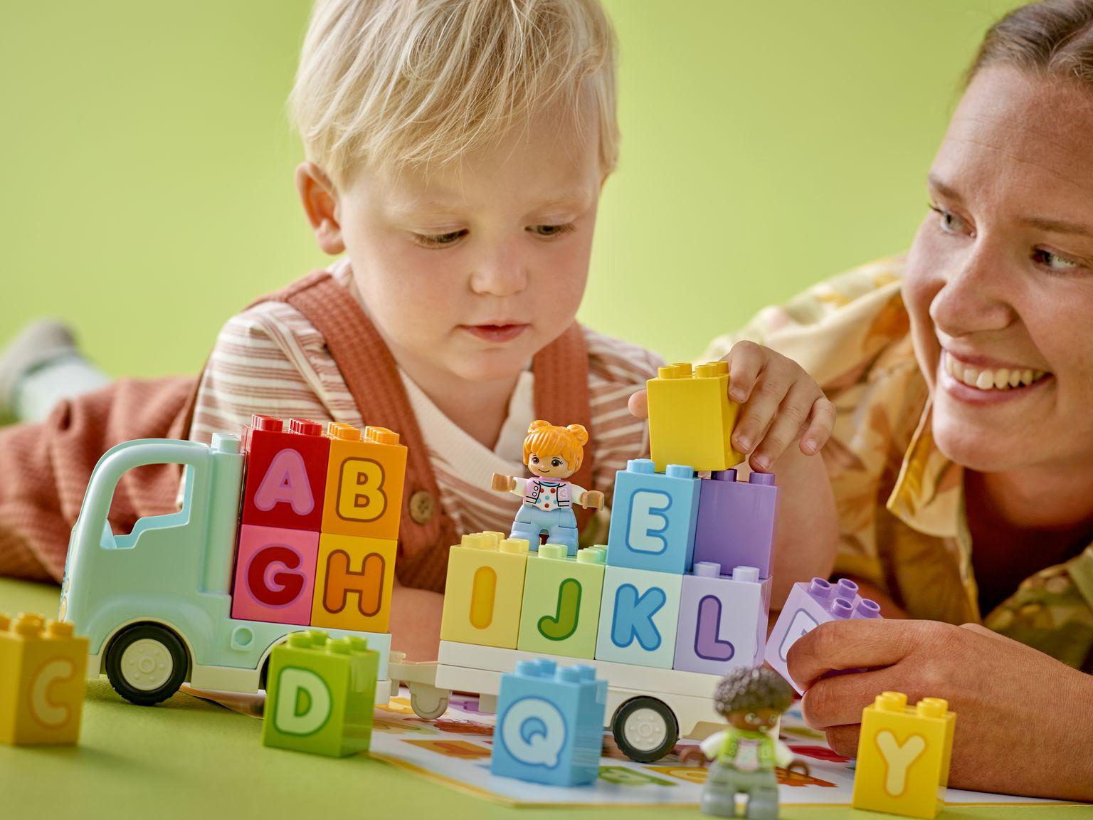 Conduce a tu bebé hacia la aventura de aprender las letras con el juguete de construcción Mi Ciudad LEGO® DUPLO® Camión del Alfabeto (10421) para niños y niñas en edad preescolar. Este creativo set del abecé proporciona infinidad de experiencias de aprendizaje mediante el juego. Mientras los bebés conectan el tráiler al camión de juguete y ayudan a las 2 figuras LEGO DUPLO a cargar y descargar los ladrillos, empiezan a reconocer las letras, aprenden los colores, mejoran su destreza lingüística y desarrollan su motricidad fina. Incluye imaginativos accesorios, como elementos LEGO DUPLO que representan una cartilla y un equipo estéreo para animar a los bebés y sus papás a cantar el abecedario. El juguete educativo invita a los preescolaresa inventar creativas historias sentados en la cabina del camión, ¡rumbo a una nueva aventura! Ofrece a tu bebé un fantástico comienzo con los juguetes de construcción LEGO DUPLO, que ponen el juego libre, la autoexpresión y el aprendizaje en sus manos.