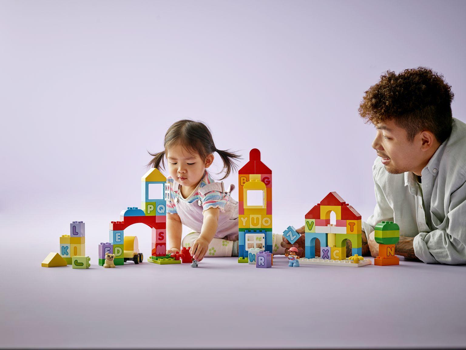 ¿Buscas el mejor juguete para ayudar a tu bebé a reconocer las letras? El juguete educativo LEGO® DUPLO® Classic Ciudad Alfabeto (10935) incluye todas las letras del alfabeto y un coche conducible, así como figuras de una niña, un niño y un carlino para pasarlo genial jugando con creatividad durante horas. Ideal como primer set LEGO, permite a los peques crear y recrear un sinfín de divertidos y coloridos edificios. Aprender es divertido Las oportunidades de aprender son ilimitadas. Los preescolares, además de empezar a reconocer el alfabeto y los colores, podrán explorar nuevas e interesantes formas. Y con tantos ladrillos como tiene el set, les encantará construir la torre más alta del mundo… para, por supuesto, ¡disfrutar derribándola después y volviéndola a construir! Los sets de juguetes LEGO DUPLO contienen personajes con los que es fácil identificarse, ladrillos de brillantes colores y atractivos detalles para desarrollar la expresión personal mediante el juego creativo.