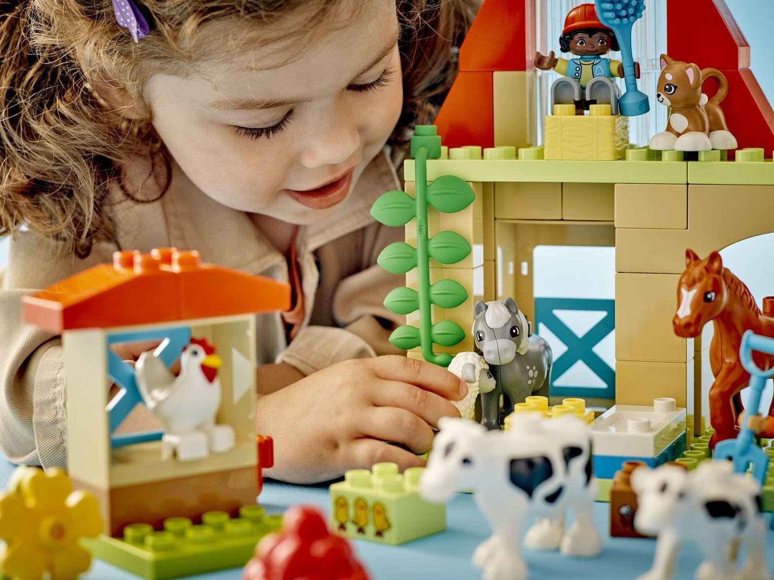 ¿Conoces a un bebé que adore los juegos de granja? El set Cuidado de Animales en la Granja (10416) es el regalo ideal para jóvenes amantes de los animales. Este juguete de aprendizaje para bebés de 2 años o más incluye 8 figuras LEGO® DUPLO® de animales (como una oveja, una vaca, un caballo y pollitos) y entusiasmará a los preescolares que disfrutan con los juguetes basados en interpretar actividades de la vida real, ¡o haciendo nuevos amigos! El detallado juguete implica a toda la familia en el juego afectivo y permite a los papás enseñarle a su bebé a alimentar a los animales y cuidar de ellos. El granjero, en la casa de labranza, ayuda a la figura del niño a lavar las manzanas para dar de comer a la vaca y el ternero. En el gallinero,la gallina cuida de sus pollitos. Los bebés también pueden imaginar que pasean a lomos del caballo y le dan heno en el establo. Este juguete educativo con ladrillos de colores desarrolla las habilidades motrices finas y de resolución de problemas.