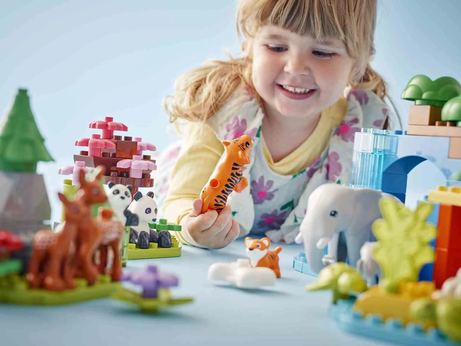 ¿Buscas un regalo para tu preescolar amante de los animales? Con el juguete Familias de la Fauna Salvaje “3 en 1” (10446), ¡viajará por el mundo viviendo aventuras! Este juguete de aprendizaje lleno de elementos educativos incluye 10 figuras LEGO®DUPLO® de animales. Este juguete para bebés trae una escena de la sabana donde las figuras de una tigresa y su cachorro se alimentan de un hueso y juegan en las rocas, y una figura de un elefante lleva a su cría a una cascada. Los peques usarán sus hab ilidades motrices finas para enganchar al elefantito a la cola del elefante adulto. En la playa, las figuras de unas tortugas ponen huevos. En el bosque, las figuras de un panda y su osezno juegan bajo el cerezo en flor y las figuras de los ciervos pastan en un claro. Los jóvenes amantes de los juguetes basados en la naturaleza trabajan un montón de habilidades. Pueden emparejar y comparar a adultos y crías, decidir qué comen y usar su creatividad para reconstruir este set LEGO DUPLO “3 en 1”.