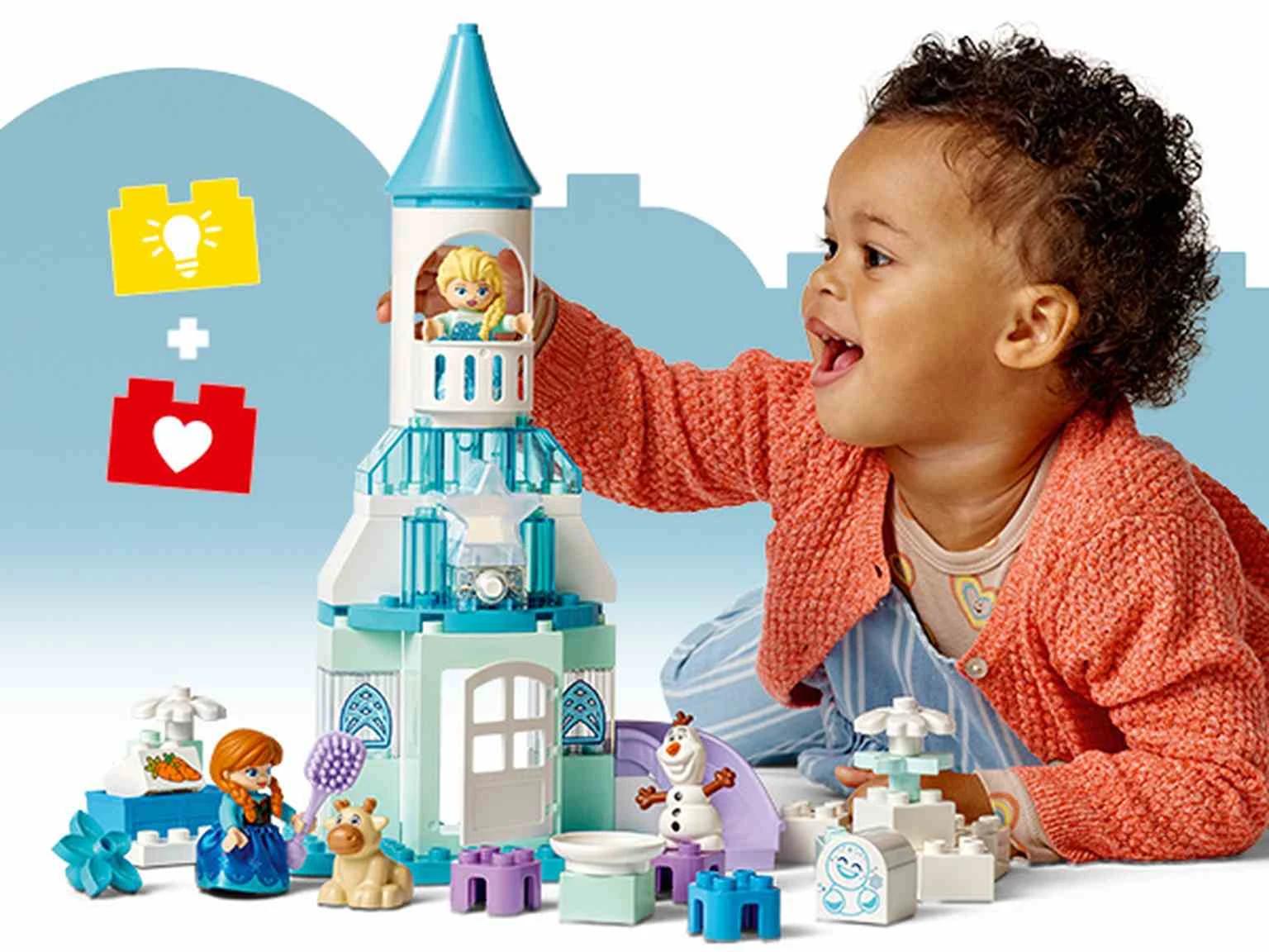 ¡Sumerge a tu bebé en un mundo de juego creativo con el juguete construible LEGO® DUPLO® ǀ Disney Frozen: Fiesta en el Castillo de Anna y Elsa (10455)! Los personajes LEGO DUPLO ǀ Disney incluidos (Elsa, Anna, Malvavisco el Nevadito, Sven bebé y Olaf) ofrecen a los preescolares infinitas oportunidades de imaginar qué harían si vivieran en un castillo y tuvieran que cuidar de Sven bebé. El set ayuda a los peques a trabajar la motricidad fina construyendo el castillo. También incluye accesorios para fomentar el juego basado en cuidar de otros. Los preescolares y su familia usan su imaginación para interpretar que atienden con cariño al reno bebé. Este juguete de construcción y aprendizaje para bebés tiene montones de detalles para estimular los sentidos. Elsa y Anna llevan faldas de tela, hay una puerta abisagrada que los deditos pueden abrir para explorar el interior del castillo de Frozen y el set trae un ladrillo con luz multicolor que representa la aurora boreal. Contiene 54 piezas.