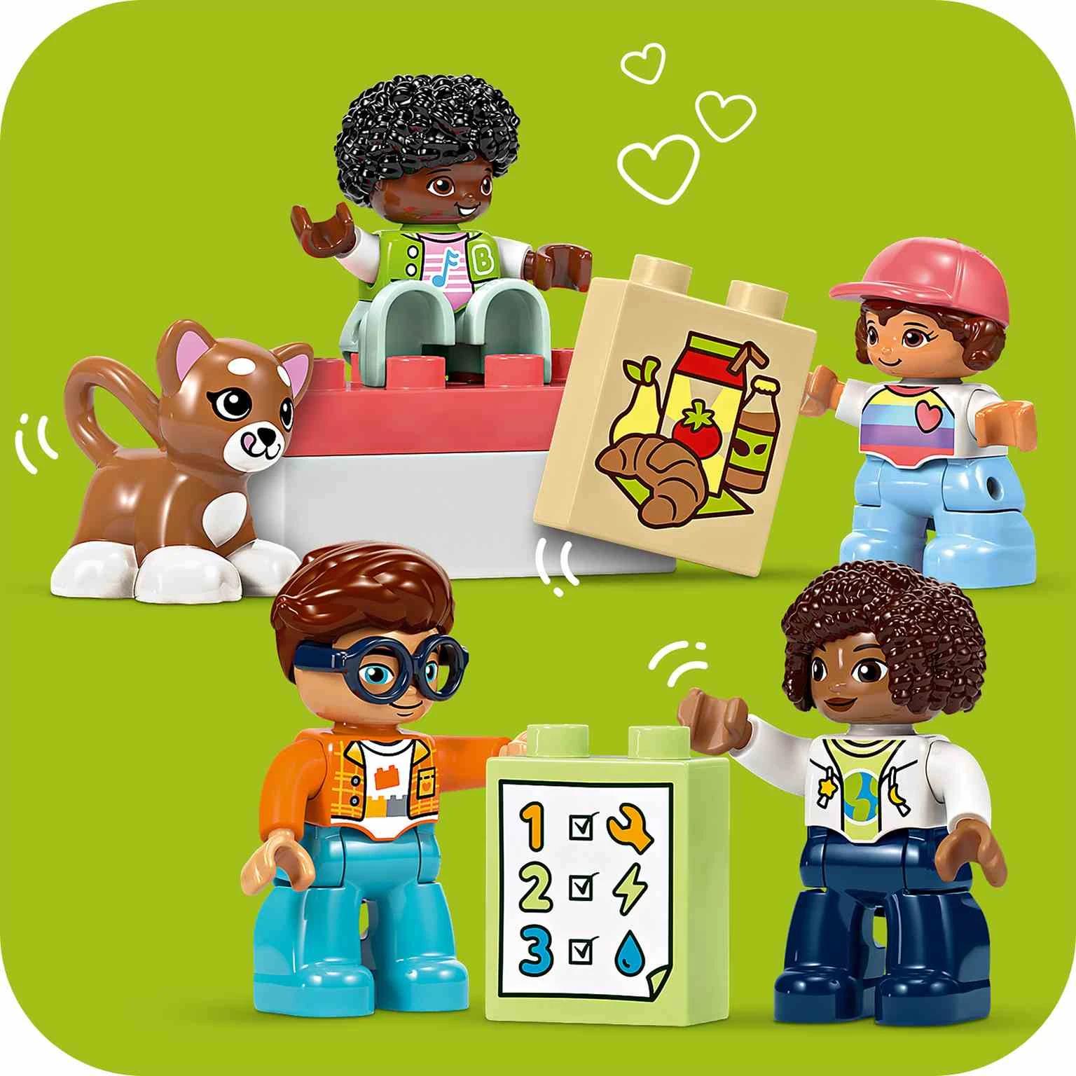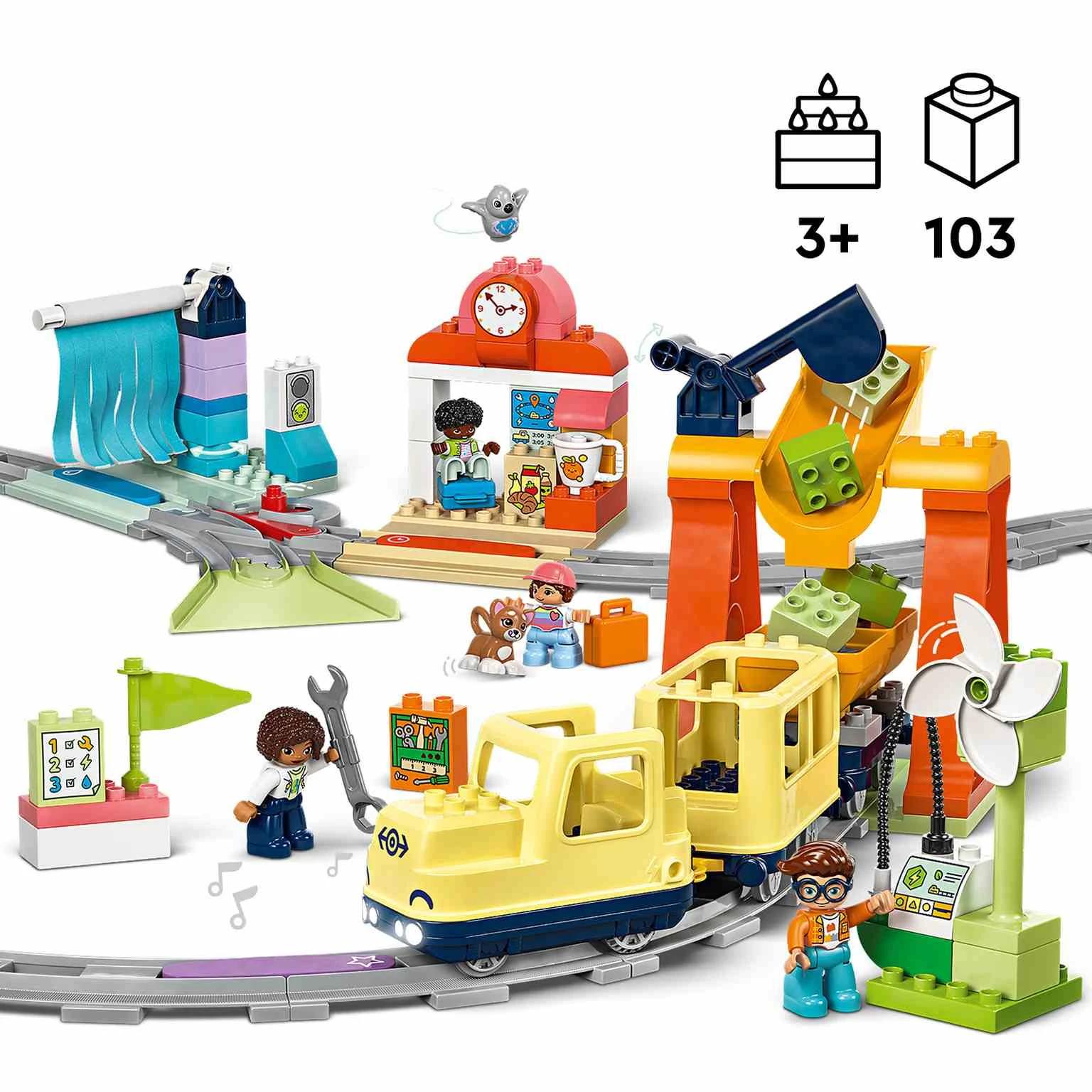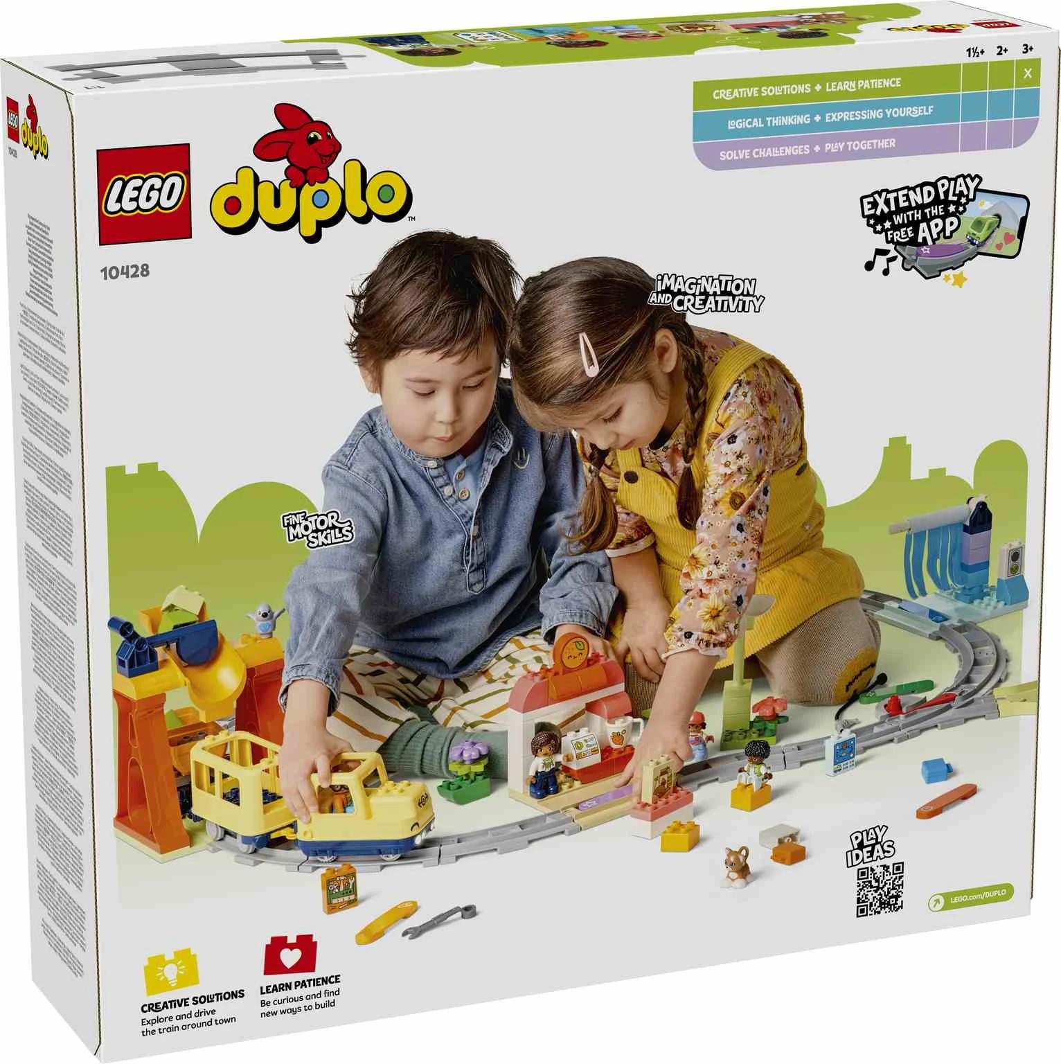 Los preescolares de 3 años o más emprenden un viaje lleno de imaginación con el set Gran Tren Comunitario Interactivo (10428). Este trepidante juego rebosante de detalles y funciones incluye 4 figuras diversas y proporciona horas de aprendizaje experiencial. El viaje de los bebés rumbo al aprendizaje comienza en la estación. Los preescolares usan el pensamiento creativo para trazar la ruta del tren de pasajeros Push-&-Go y se enfrentan a divertidas tareas de resolución de problemas por el camino. Pueden cargar mercancías en el tren, recargar el motor o lavar los vagones. Cada actividad cobra vida con luces y sonidos cuando el tren de juguete pasa sobre uno de los 5 ladrillos de acción. El set también ayuda a desarrollar la paciencia y lacuriosidad mientras los peques descubren nuevas formas de construir la vía. La app gratuita LEGO® DUPLO® Interactive Trains permite a los bebés grabar sus propios sonidos para el viaje y conducir la locomotora con un dispositivo electrónico portátil.