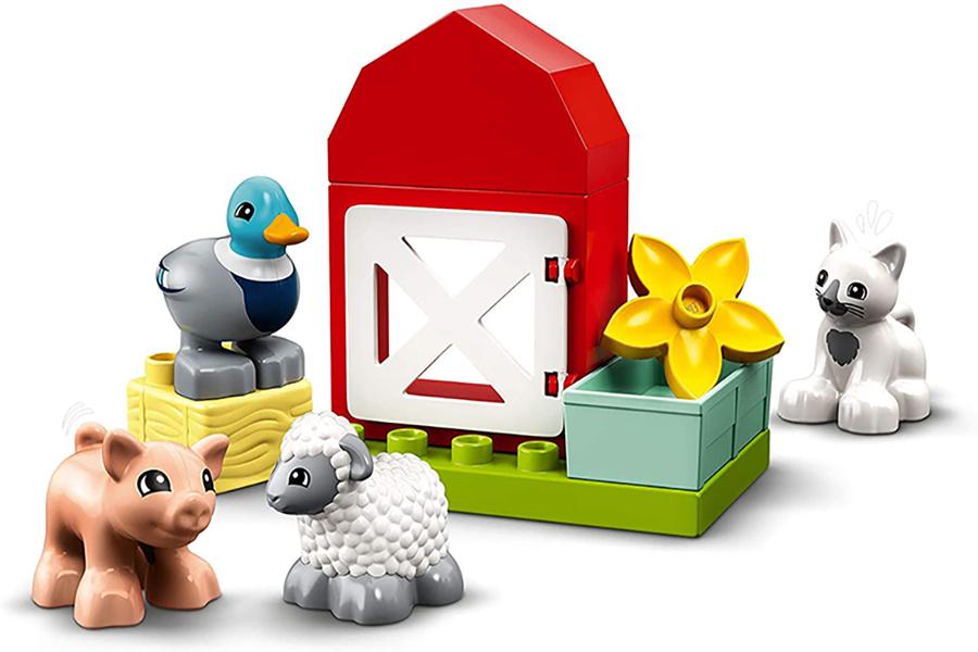 Incluye figuras de un cerdo, una oveja, un pato y un gato, todas con preciosos colores y especialmente diseñadas para que los bebés las cojan y jueguen con ellas. También trae un establo construible y una paca de heno con textura realista.