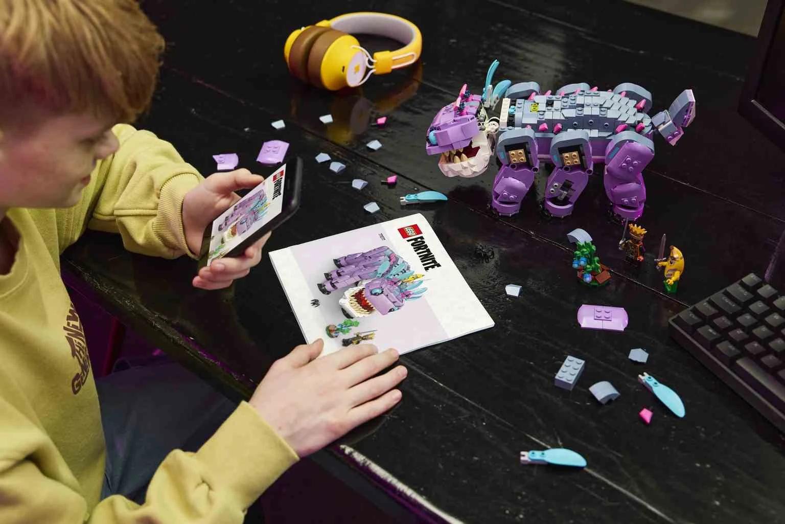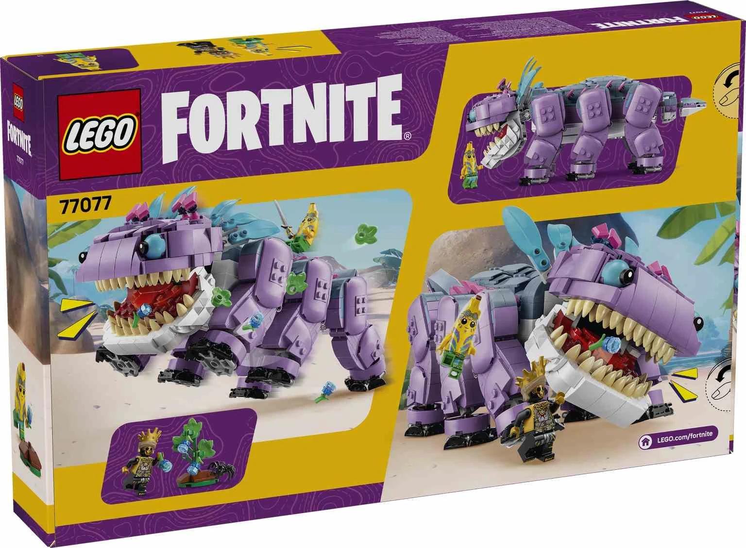 Los fans y los jugadores construyen un emblemático personaje de LEGO® Fortnite® y se hacen amigos de él con el set LEGO Fortnite Klombo (77077) para niños y niñas a partir de 10 años. Klombo es una gran criatura del videojuego LEGO Fortnite, y este kit de construcción ofrece a los peques la oportunidad de divertirse recreándola con ladrillos LEGO. Luego descubrirán sus geniales detalles, como las patas móviles, la boca que se abre y la cola giratoria. El set trae un arbustito de bayas klombo que se quitan para dárselas a Klombo y hacerse amigos suyos después de ponerlo furioso. Cuenta también con minifiguras de Banano aventurero isleño y Oro, que puedes colocar en el lomo de Klombo. El juguete, un regalo ideal para jugadores de todas lasedades, incluye un fantástico objeto de bonificación digital. Los jugadores escanean el código QR de las instrucciones de construcción para canjearlo por el traje de Banano aventurero isleño en el videojuego LEGO Fortnite. El set contiene 1084 piezas.