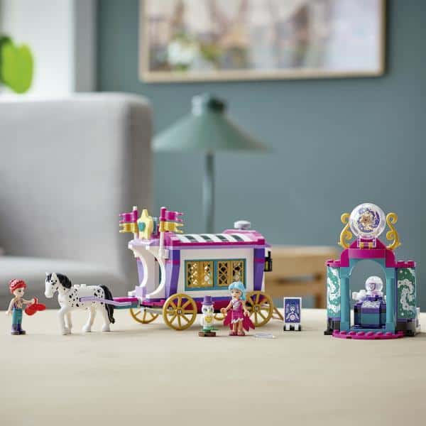 ¿Lista para adentrarte en un mundo de magia y misterio? ¡Te damos la bienvenida a esta caravana mágica! Mia ha ido a visitar a la pitonisa Claire, que adivina el porvenir. Entra en la caravana y saluda a Spades, el sabio búho. Prepara un poco de té en el hornillo y, después, dale una manzana al caballo. Únete a Claire en la tienda para leer el futuro a Mia. La bola de cristal gira y deja ver… ¡una cara feliz! ¡Parece que a Mia le acompañará la suerte en la feria!