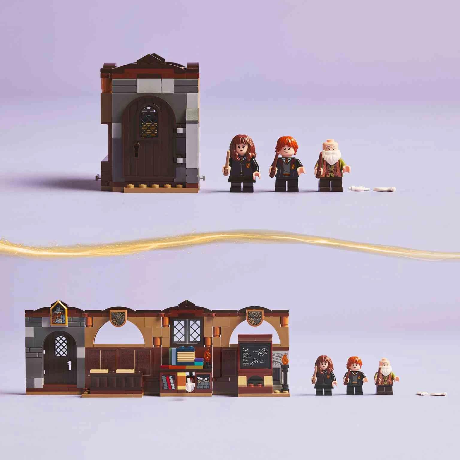 Recrea una hechizante escena de Harry Potter y la piedra filosofal™ en la clase de Encantamientos del Castillo de Hogwarts™ con este juego de juguetes (76442). El pequeño set con grandes posibilidades de juego, un divertido regalo LEGO® Harry Potter™ para mayores de 8 años, es perfecto para descubrirles el Mundo Mágico construido con ladrillos a los niños, las niñas y cualquier amante de la fantasía. El aula de Hogwarts se despliega para jugar cómodamente e incluye una función de encantamiento Wingardium Leviosa para hacer levitar una pluma, pupitres desmontables, una pizarra desmontable y más. Este mágico juguete cuenta con personajes LEGO Harry Potter (Ron Weasley™, Hermione Granger™ y el Profesor Flitwick) para interpretar imaginativas historias. Esta aula pertenece a una colección de sets de construcción LEGO Harry Potter modulares (a la venta por separado) que se conectan para crear la escena del Castillo de Hogwarts construida con ladrillos LEGO más detallada hasta ahora.