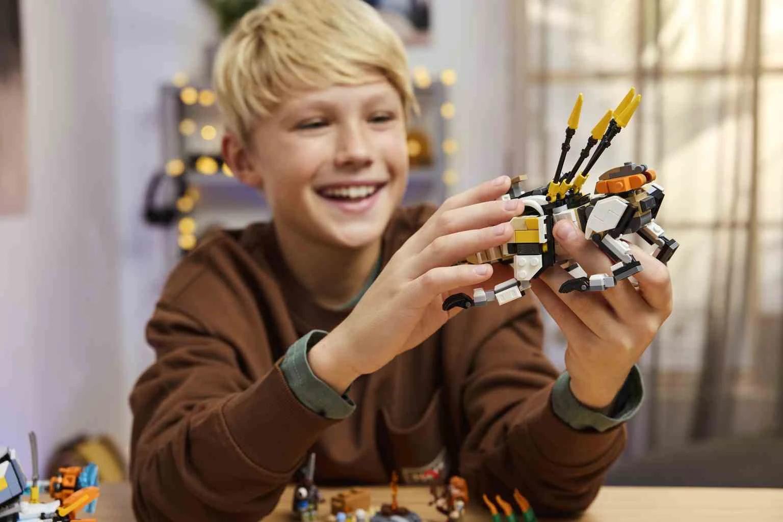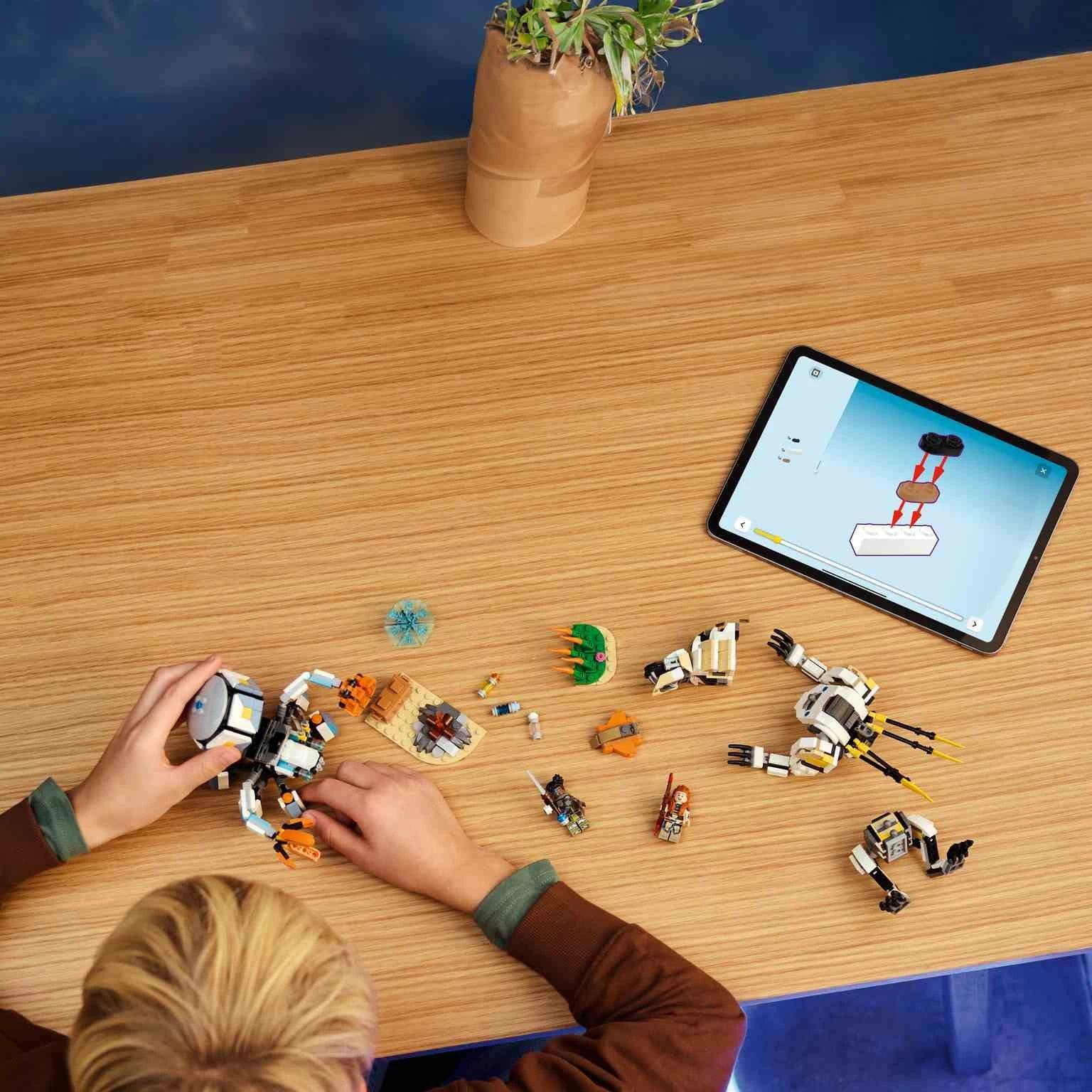 LEGO® Horizon Adventures™ Aloy y Varl vs. Cangrejo y Dientes Serrados (77037) es un juguete de fantasía coleccionable para niños a partir de 9 años. Basado en el videojuego LEGO Horizon Adventures, este set LEGO de monstruos mecánicos de juguete incluye 2 minifiguras: Aloy y su fiel aliado Varl. Aloy lleva un arco y Varl porta una lanza. Cada arma dispone de mejoras que pueden agregarse para habilitar métodos de ataque mediante fuego, hielo o descargas eléctricas, lo mismo que en el videojuego. También se incluyen 2 criaturas robóticas construibles. Cangrejo tiene patas y brazos articulados, pinzas que se abren, una cápsula de carga desmontable y un escudo de energía. Dientes Serrados tiene mandíbula que se abre y torso que gira, además de cuello, cabeza y patas articuladas. Para estimular la imaginación, se incluyen juncos, fogata, cofre con tesoro y varias cosas más. Échale un vistazo a la app LEGO Builder para incorporar una dimensión digital a la diversión.
