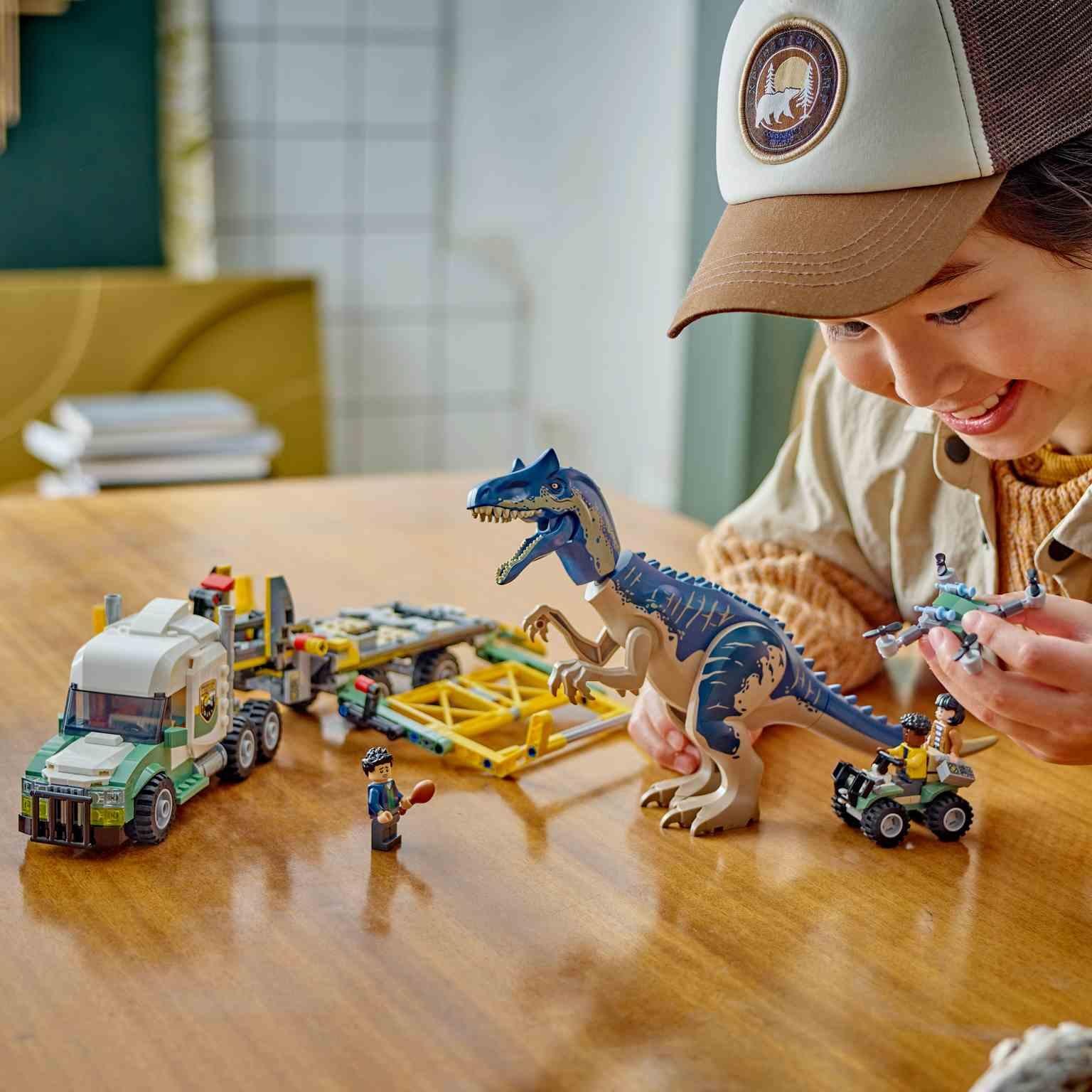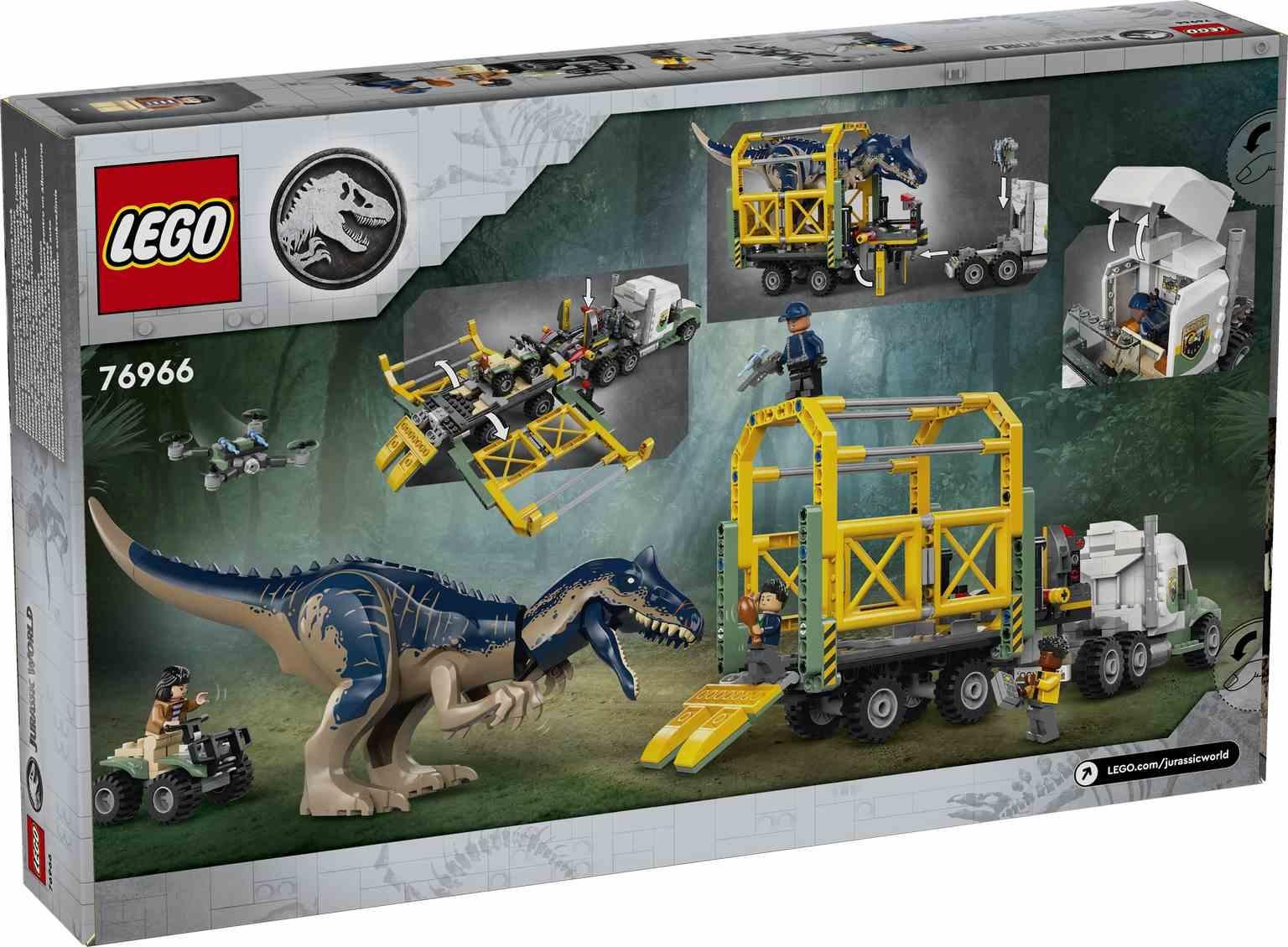 A los fans de 8 años o más les esperan nuevas e inesperadas aventuras de animales con el set Misiones Dinosaurio: Camión de Transporte del Allosaurus (76966), ¡un modelo lleno de posibilidades de interpretar historias! Este juguete LEGO® Jurassic World es un regalo perfecto para fiestas. Permite a los niños contar un sinfín de emocionantes historias protagonizadas por la figura moldeada de un Allosaurus con patas, cabeza y boca móviles, y por las minifiguras de Darius, Kenji, Yaz y un guarda. Hay un camión articulado con techo y capó que se abren, una cabina para 3 minifiguras con cama, un tráiler con soportes frontales, rampa trasera y jaula que se abre presionando una palanca, un quad y un dron, además de montones de elementos para inventar historias. La app LEGO Builder guiará a los jóvenes fans de los dinosaurios a través de una intuitiva aventura de construcción con herramientas para acercar y girar versiones 3D de sus modelos, guardar sets y seguir sus progresos.