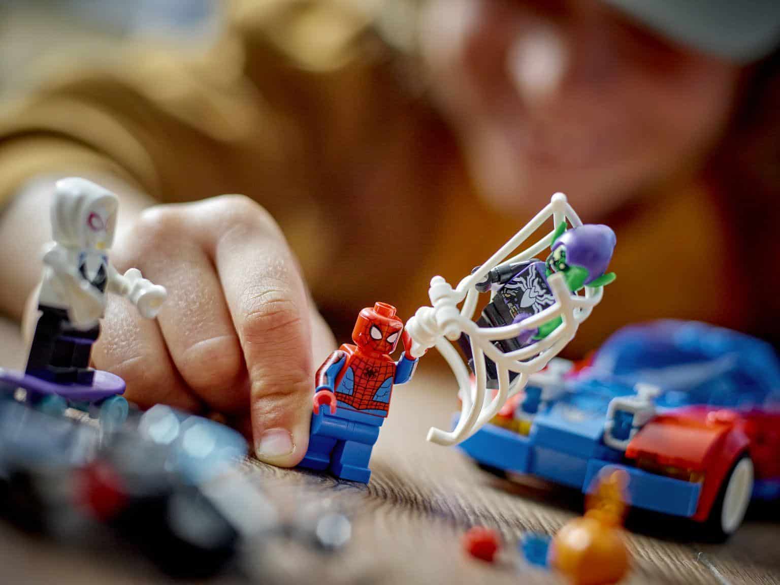 Los fans de los superhéroes, las minifiguras de personajes Marvel y los vehículos alucinantes quedarán impresionados con este juguete LEGO® Marvel construible que incluye el coche de Spider-Man, el deslizador del Duende Verde y el monopatín de Spider Fantasma. El set Coche de Carreras de Spider-Man y Duende Verde Venomizado (76279) es un juguete de tendencia fantástico como regalo para niños y niñas de 7 años o más. Spider-Man, Spider Fantasma y el Duende Verde Venomizado se enfrentan en sensacionales vehículos con un fabuloso surtido de armas y accesorios. El coche de Spider-Man está equipado con 2 cañones frontales, el deslizador del Duende Verde cuenta con 2 cañones y él lleva bombas-calabaza, y Spider Fantasma, montada en su monopatín, empuña 2 aracnoblásteres. Spider-Man usa una “cuerda” arácnida flexible para balancearse y una gran telaraña para capturar a los villanos. El coche tiene secciones desmontables para acceder al interior, con espacio para 2 minifiguras y el monopatín.