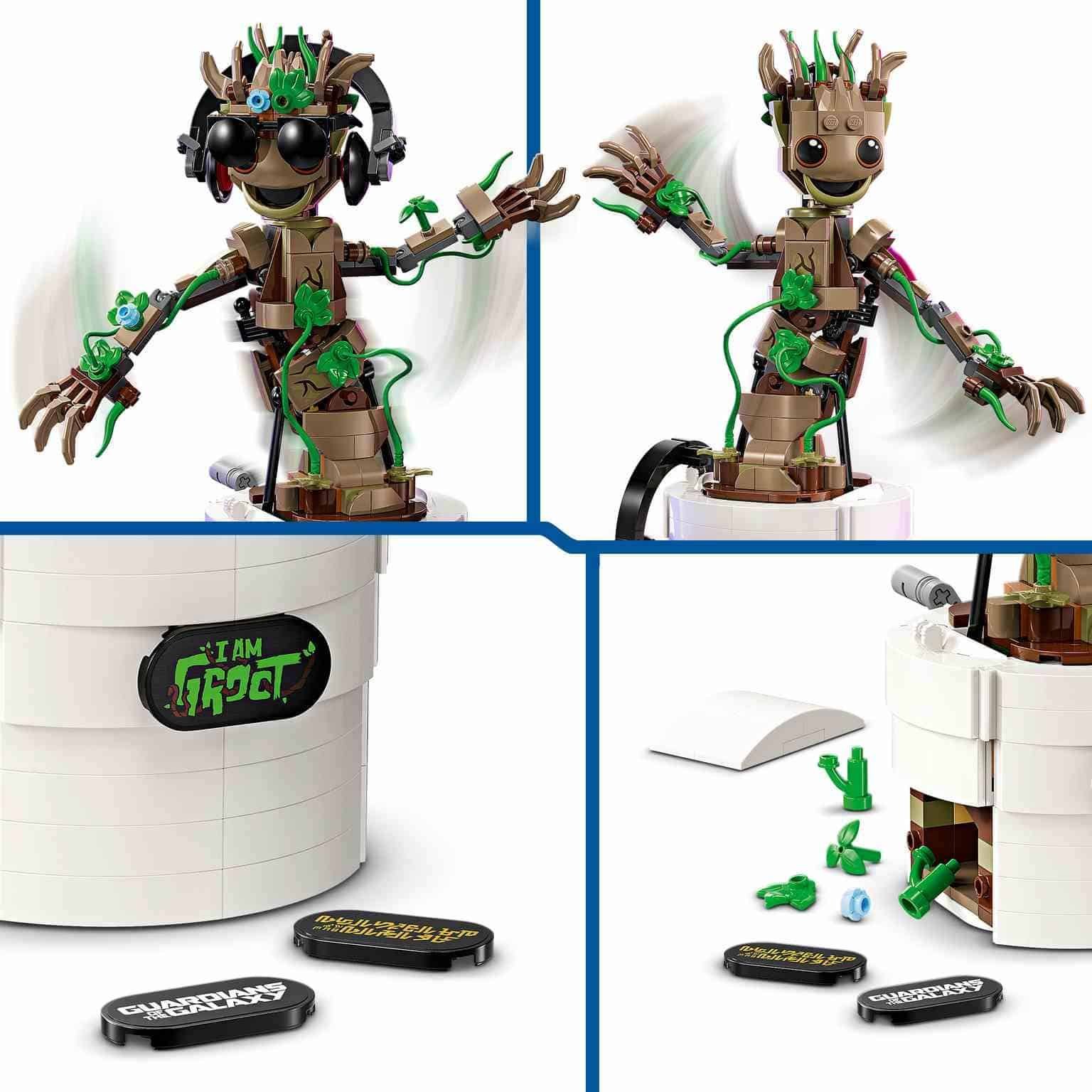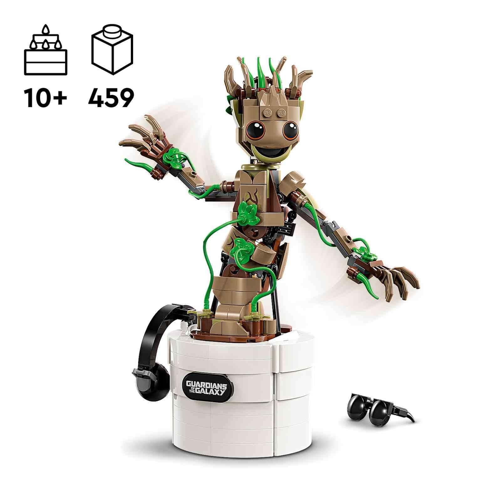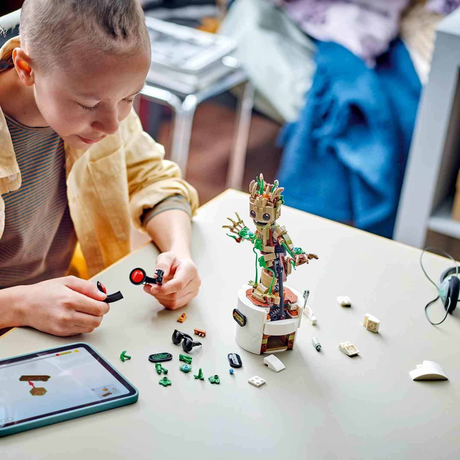 Groot Bailarín LEGO® Marvel (76297) es un juguete construible basado en Guardianes de la galaxia con una función de baile interactiva. Es fantástico como regalo para niños y niñas a partir de 10 años y para fans de Groot, el personaje Marvel, o delos superhéroes y los juguetes LEGO construibles. Este juguete de construcción de Groot cuenta con cabeza móvil y brazos articulados. Cuando los peques giran la manivela situada en la parte posterior de la maceta, Groot empieza a bailar. La figura pued e adaptarse con hojas adicionales, auriculares construibles y gafas de sol; además, los niños pueden personalizar la maceta de Groot colocando 1 de 3 placas de identificación en la parte frontal (incluida una relacionada con la serie para televisión Yo soy Groot). Todos estos accesorios se pueden guardar en el compartimento integrado en la maceta. Para pasarlo aún mejor construyendo, la app LEGO Builder permite a los peques acercar y girar versiones 3D de sus modelos y seguir sus progresos.