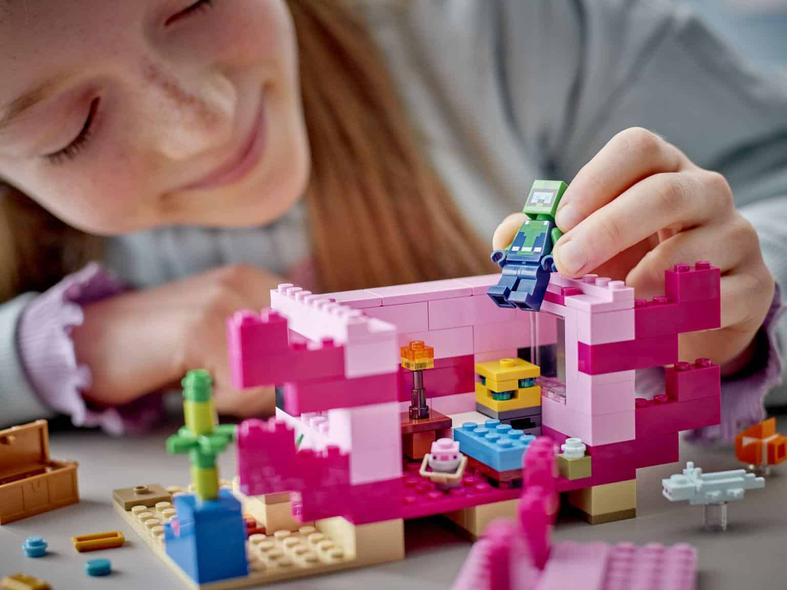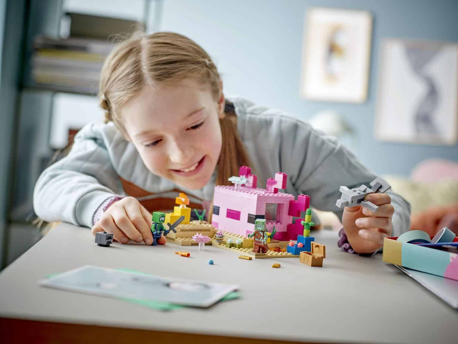 Anima a tu fan de Minecraft® a vivir aventuras submarinas con una de las criaturas más monas del videojuego: el ajolote. El set LEGO® Minecraft La Casa-Ajolote (21247) traslada la construcción creativa y la acción imaginativa de Minecraft al mundo real y las convierte en una experiencia tangible para peques a partir de 7 años. Aventuras con los adorables ajolotes de Minecraft Los niños usan sus habilidades Minecraft para construir una enorme casa de brillantes colores con la forma del popular ajolote del juego. Después, acompañan a un Buceador Explorador en infinitas aventuras con un delfín buscatesoros, un pez globo, 2 ajolotes adultos, un ajolote en un cubo y un cofre del tesoro hundido. Luego pueden quitar el techo de la casa para acceder al interior amueblado, donde hay un horno de fundición y una esponja para las fugas de agua. Pero cuando ataque el zombi ahogado, los jugadores tendrán que coger una espada y ayudar a los ajolotes a defender su base de las profundidades marinas.