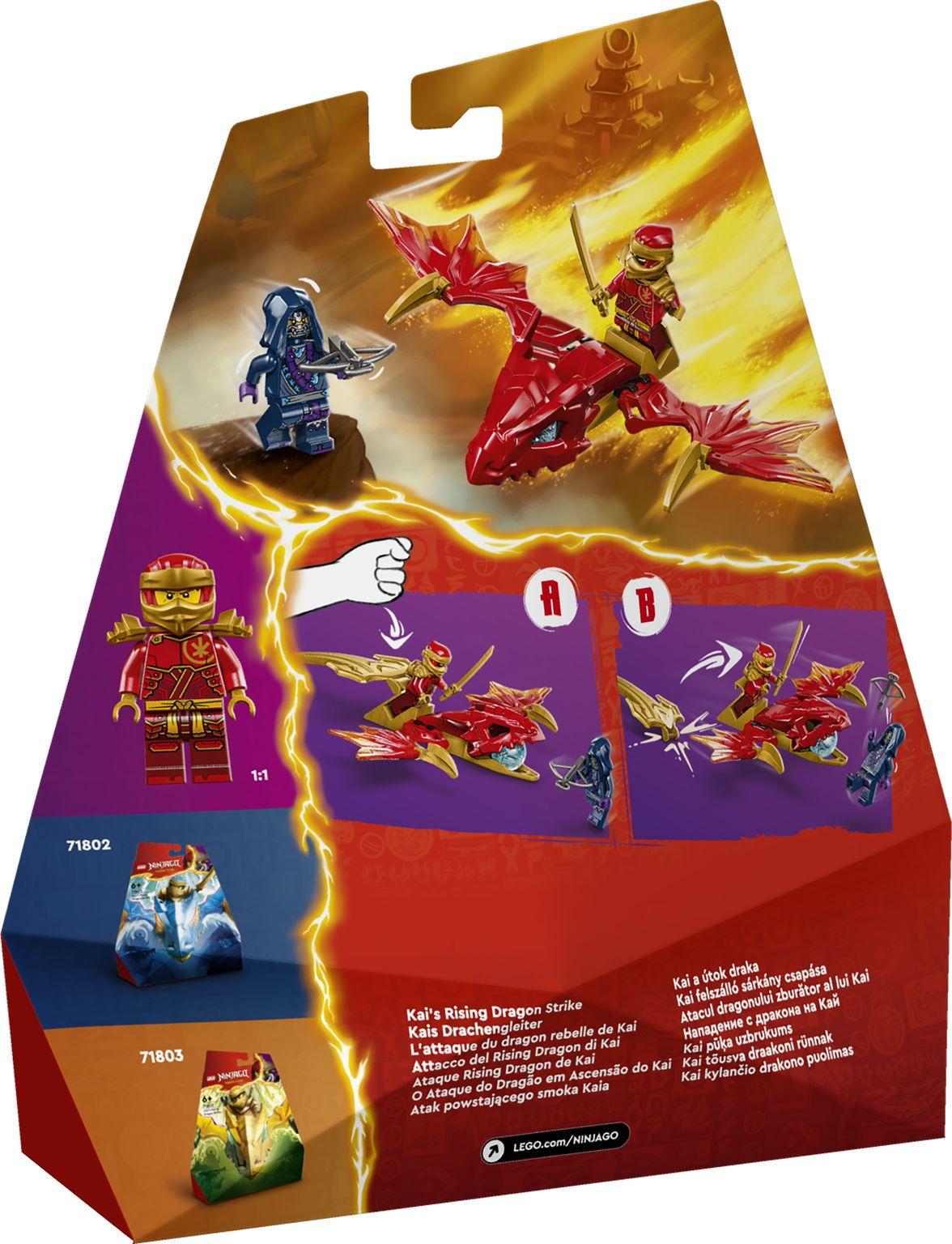 Los niños y las niñas de 6 años o más podrán recrear las aventuras de la temporada 2 de NINJAGO®: El Renacer de los Dragones con el set LEGO® Ataque Rising Dragon de Kai (71801). Se lo pasarán genial construyendo el primer juguete de acción LEGO NINJAGO con forma de dragón antes de golpear la cola dorada del dragón y ver cómo se activa al instante. Este juego incluye 2 minifiguras: Kai Rising Dragon, que viene con una catana y puede montarse en la figura de acción del dragón, y un guardián Máscara de Lobo con una ballesta. Los peques se enfrentarán a estos personajes LEGO NINJAGO en batallas para conseguir un elemento de poder dragón azul que está en la boca articulada de la figura de acción del dragón. Dentro de la gama LEGO NINJAGO de juguetes ninja construibles, los fans también encontrarán mecas, vehículos y templos para interpretar historias con sus héroes (sets a la venta por separado). Además, podrán crear cada juguete con la app LEGO Builder, su guía en una intuitiva aventura de construcción.