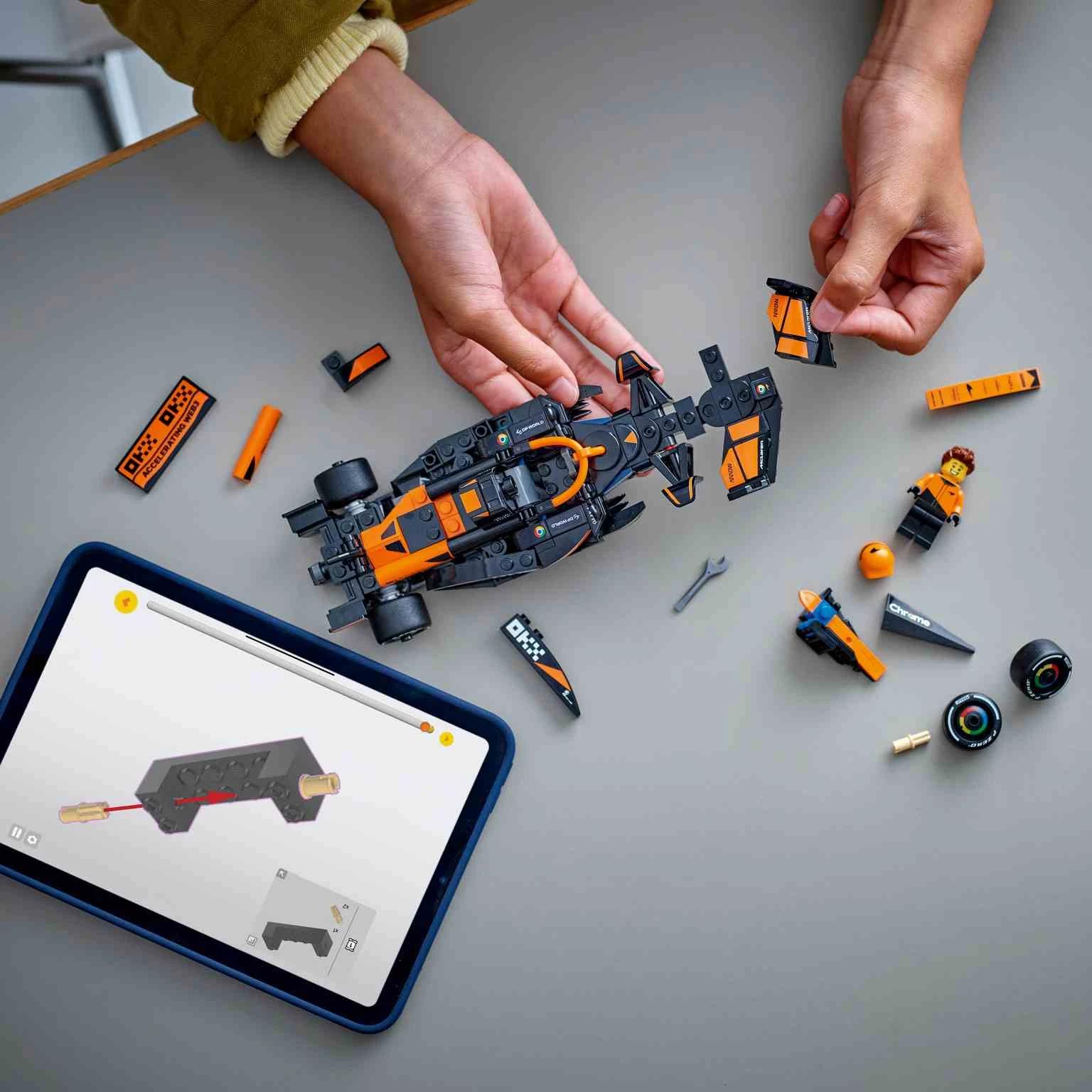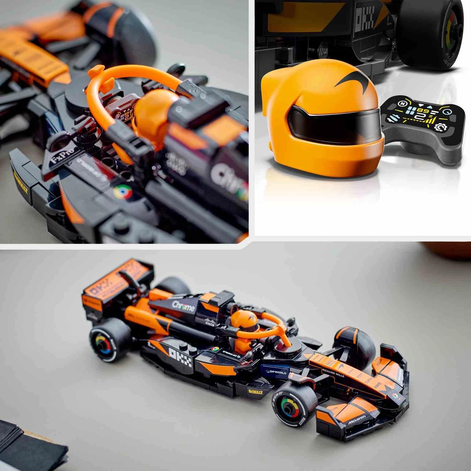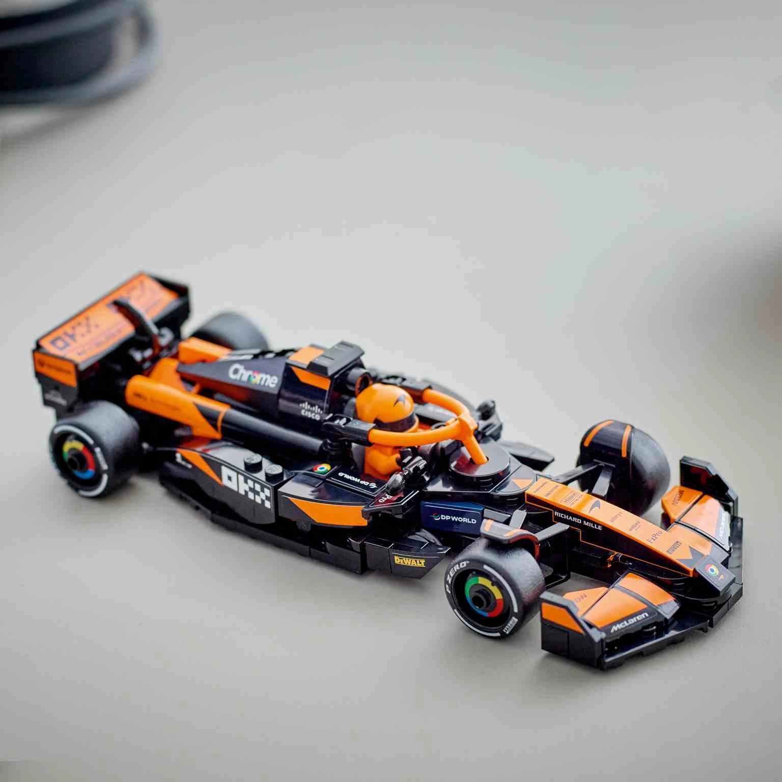 Vive toda la emoción de la Fórmula 1 con el set LEGO® Speed Champions Coche de Carreras McLaren F1® Team MCL38 (77251) para niños y niñas a partir de 10 años. Los peques y los coleccionistas de coches adultos pueden construir y exponer una maquetade un coche de carreras de F1 que reproduce detalles de diseño del modelo que compitió en la temporada 2024 de Fórmula 1. Esta maqueta de un coche de F1 cuenta con habitáculo (al que accedes levantando el halo), alerón trasero, suspensión de doble horq uilla, pegatinas de los patrocinadores y neumáticos traseros más anchos con la inscripción “Pirelli”. El vehículo de juguete viene con una minifigura de un piloto con traje de competición de McLaren y casco con alas. Los sets LEGO Speed Champions ofrecen a los niños y los apasionados del motor la oportunidad de construir maquetas de algunos de los vehículos más emblemáticos del mundo, incluidos otros coches de F1 (a la venta por separado) participantes en la temporada 2024 del campeonato.
