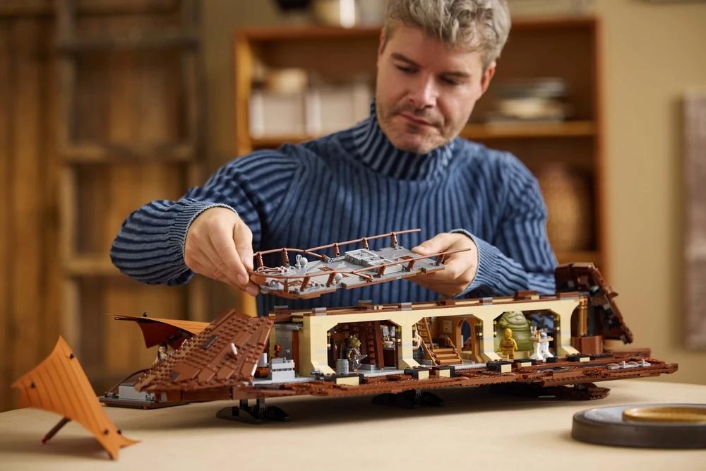 Revive las escenas de Star Wars: El Retorno del Jedi a bordo de la Barcaza Velera de Jabba LEGO® Star Wars™ Ultimate Collector Series (75397). Este divertido modelo para adultos, un gran regalo para fans de Star Wars o coleccionistas de sets UCS, mide aproximadamente 77 cm de longitud. Su cubierta y sus velas de tela ajustables se pueden retirar, y cuenta con costados abatibles para ver el interior. Explora el puente de mando, la celda, la armería y la sala de entretenimiento, equipada con la cama de Jabba y más. El set incluye 11 personajes de Star Wars en formato de minifigura LEGO, entre ellos C-3PO, la Princesa Leia y Bib Fortuna, y una figura LEGO del droide R2-D2 con una mesa de bar, ¡como en Star Wars: El Retorno del Jedi! La basetiene espacio para la figura LEGO de Jabba el Hutt, una placa y un ladrillo por el 25 aniversario de LEGO Star Wars. Para recrear la escena completa de Star Wars: El Retorno del Jedi, agrega el set Esquife del Desierto y Fosa del Sarlacc (75396).