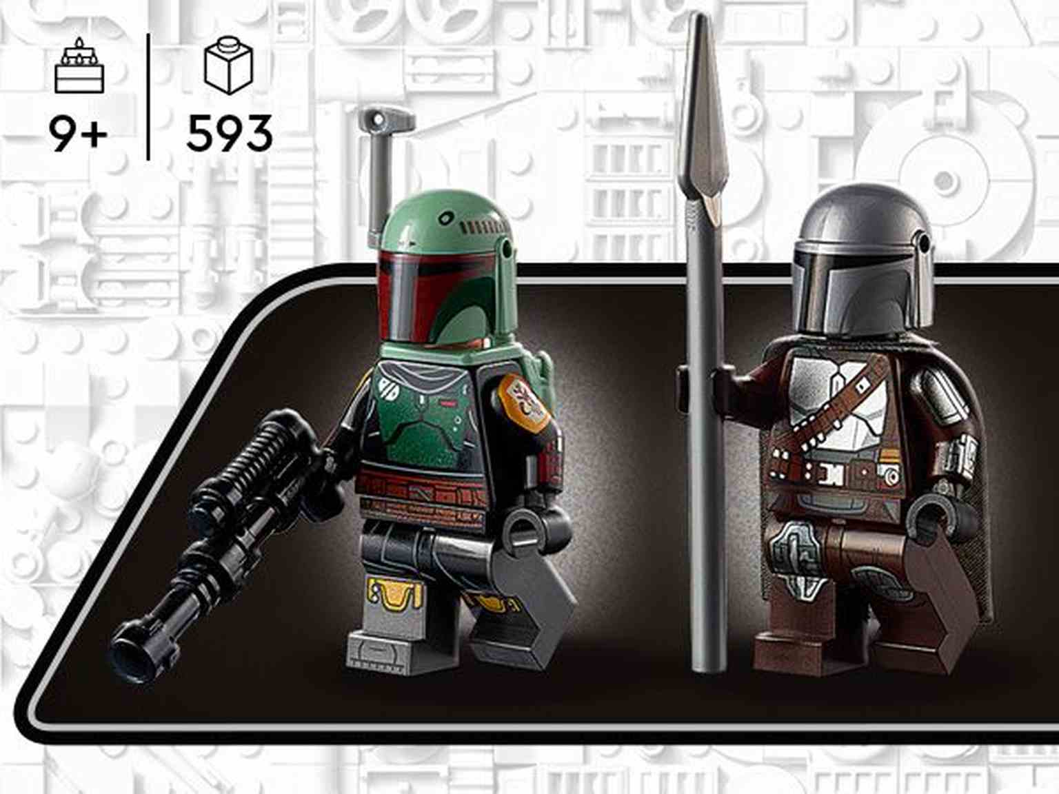 ¡Construye la distintiva Nave Estelar de Boba Fett y emprende emocionantes misiones con el Mandaloriano! Salta a la cabina y conviértete en un aguerrido cazarrecompensas. Dispara el cañón, apunta a los enemigos con el doble cañón bláster giratorio y congélalos en carbonita. Aterriza en Tython y usa el vehículo de transporte para mover la nave estelar (o exponla en posición de vuelo vertical).