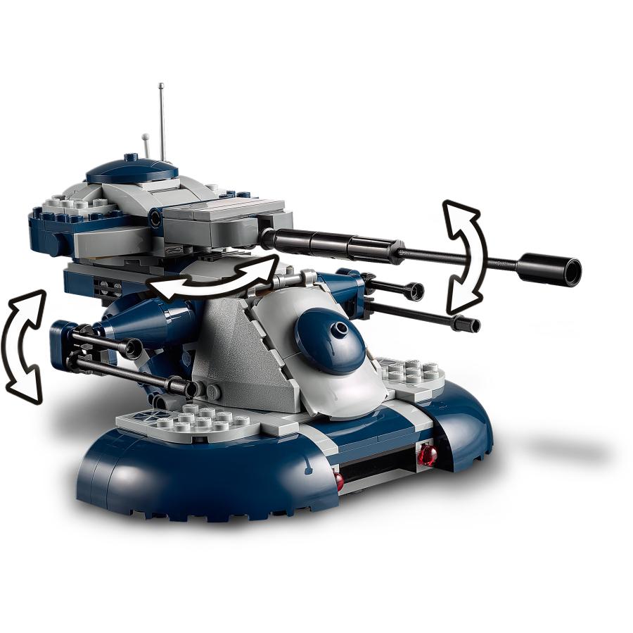 • El juguete de construcción del AAT cuenta con numerosos detalles geniales y superútiles en las batallas, como 2 cañones automáticos, una torreta giratoria con cañón inclinable y escotillas abatibles en la parte delantera y en la torreta para colocar dentro a los droides de combate.